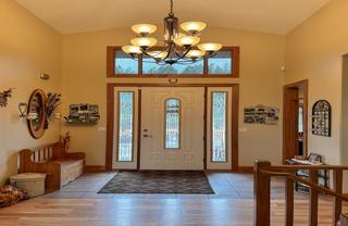 Welcome to your dream home! Nestled on an expansive .99-acre lot, this beautifully finished 4-bedroom, 3-bathroom home exudes elegance and comfort. As you step inside, you're greeted by floor-to-ceiling windows that flood the main living area with natural light, accentuated by soaring vaulted ceilings. The heart of the home features an inviting custom kitchen that includes granite counter tops, stainless steel appliances and a gas range. The main floor primary bedroom is complete with his and her closets and a spa-like ensuite - Unwind in the jetted soaker tub or large tiled shower enclosure. Three additional well-appointed bedrooms offer ample space for family, guests, or a home office. You will appreciate the thoughtful design of the lower level, which boasts a separate kitchen area and a spacious rec room. The outdoor space is a true haven, featuring a hot tub for ultimate relaxation, a paved driveway, an exposed aggregate patio, perfect for outdoor entertaining. With private lake access, you can enjoy fishing, kayaking, or simply soaking in the surroundings. For those with hobbies or needing extra storage, the property includes a quonset and a sea can, providing ample space for all your tools and toys. The triple car garage offers convenience and security for your vehicles or extra storage needs. This home is more than just a property; it's a lifestyle.